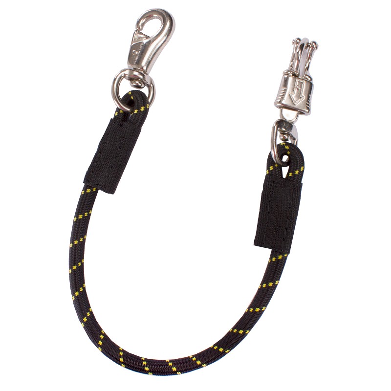 Elastična kratka vrvica za prikolico s trdno sponko in panik kavljem, zaključena z najlonskim trakom. Praktična in varna, če se uporablja za pritrditev konja v prikolici. Velikost: |