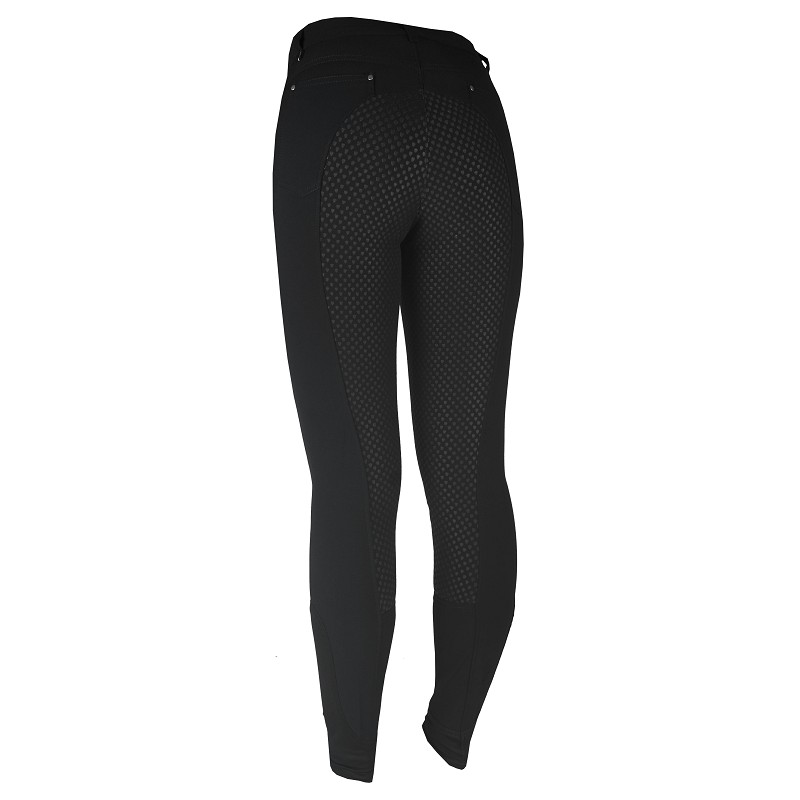 Klasične ženske jahalne hlače z dvema žepoma spredaj, dvema žepoma zadaj, kontrastno tkanino z rebri in mat silikonskim polnim sedežem.