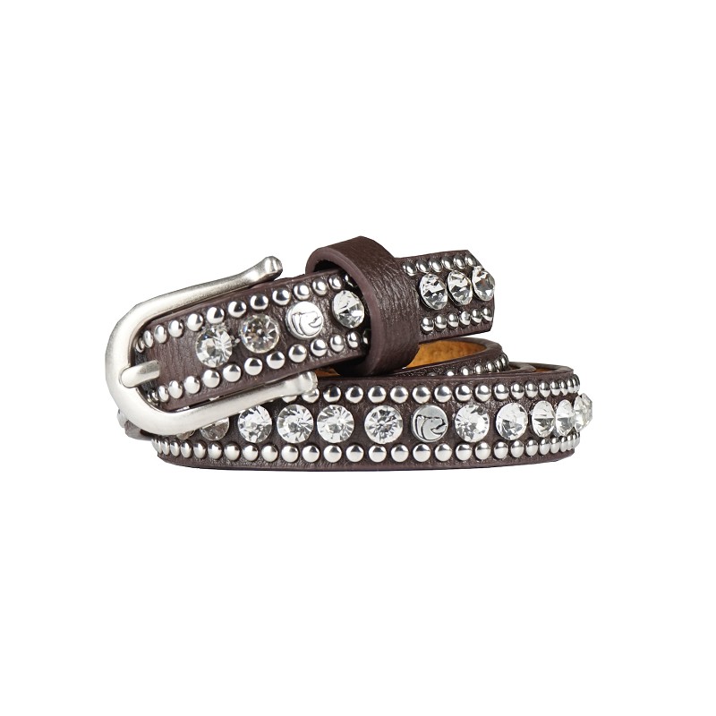 Eleganten ženski pas iz usnja/pu. Zaključek z (bleščečimi) čepi v srebrni in kovinski barvi, zmes so dodane konjske glave.